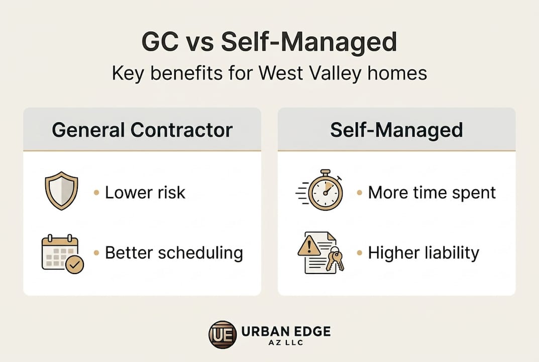 In the West Valley specifically, projects like full kitchen remodels, primary bathroom additions, room additions in Buckeye or Goodyear, and custom home builds in developing communities all fall firmly in the "hire a GC" category.